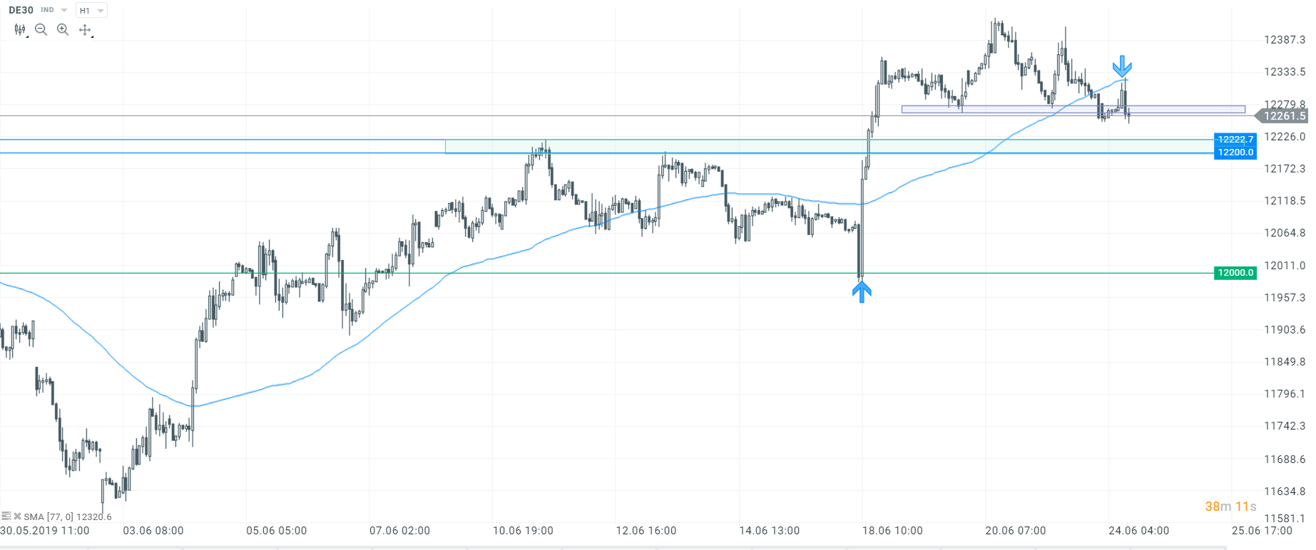 On H1 interval the German index DAX is trading close to the support area. There is a possibility for a corrective move after last week gains. First bearish signals have already occurred as the price has slid under the SMA and one can see the SHS formation from classic technical analysis, which often heralds a downward move. The key support is located around 12 200 pts. Only after breaking this level, the bigger correction move could occur. Source: xStation5
