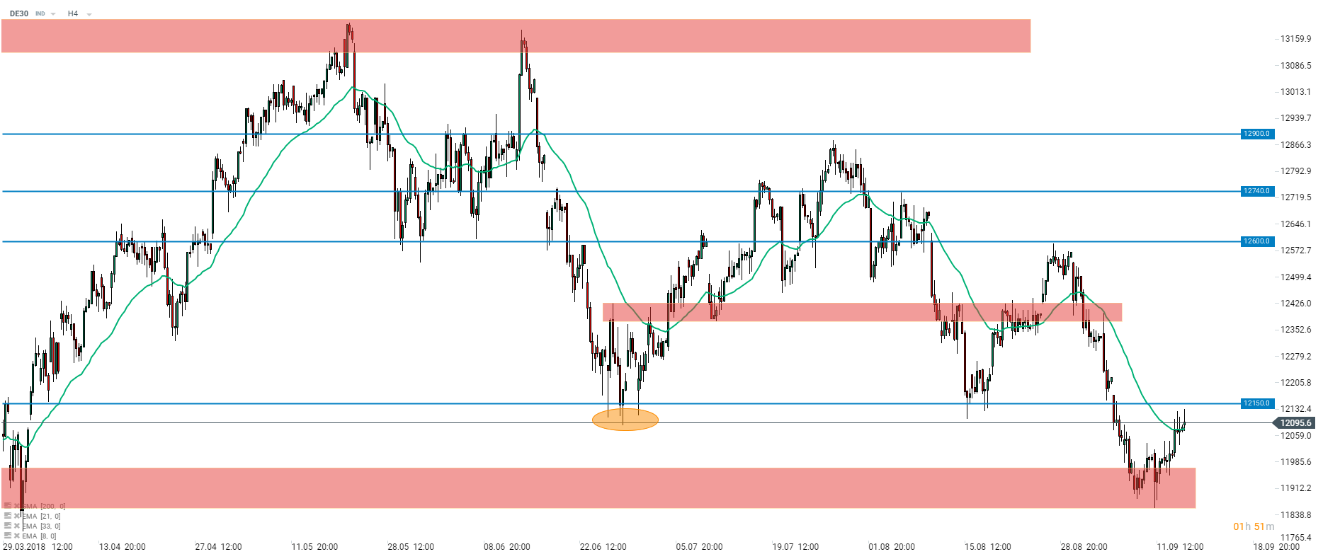 DE30 (DAX futures underlying) moved above the 33-period moving average (green line) yesterday and is trading in the vicinity of late-June’s swing level (orange circle). Morning surge was halted around 12130 pts handle but in case the aforementioned moving average is used as a support by buyers repeated upward move toward 12150 pts handle may be on cards. Source: xStation5
