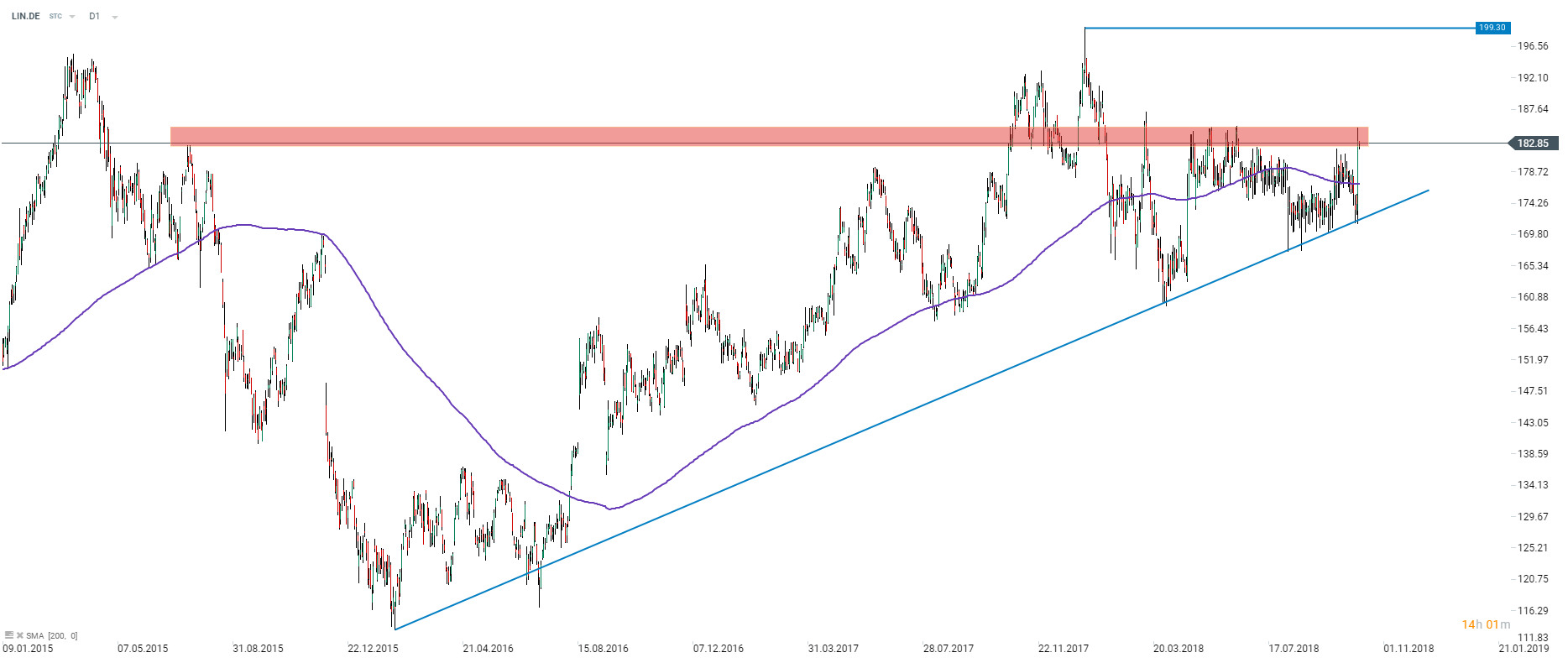 Linde (LIN.DE) share price managed to bounce higher off the upward trend line. The stock reached a long term price zone that may turn to be a hurdle for bulls. Note that shares that are not being subject to tender offer trade around €5 below the price offered by the company (€188.24). Source: xStation5