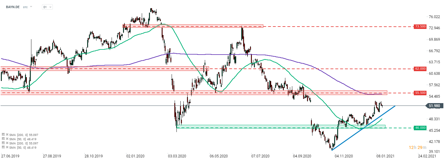 Bayer (BAYN.DE) is trading slightly lower today. However, the stock still remains above the short-term upward trendline. Two levels to watch should we see a resumption of the upward move are a local peak at around €53.15 and the mid-term resistance zone ranging around €55.50, that is additionally being strengthened by the 200-session moving average (purple line). Source: xStation5