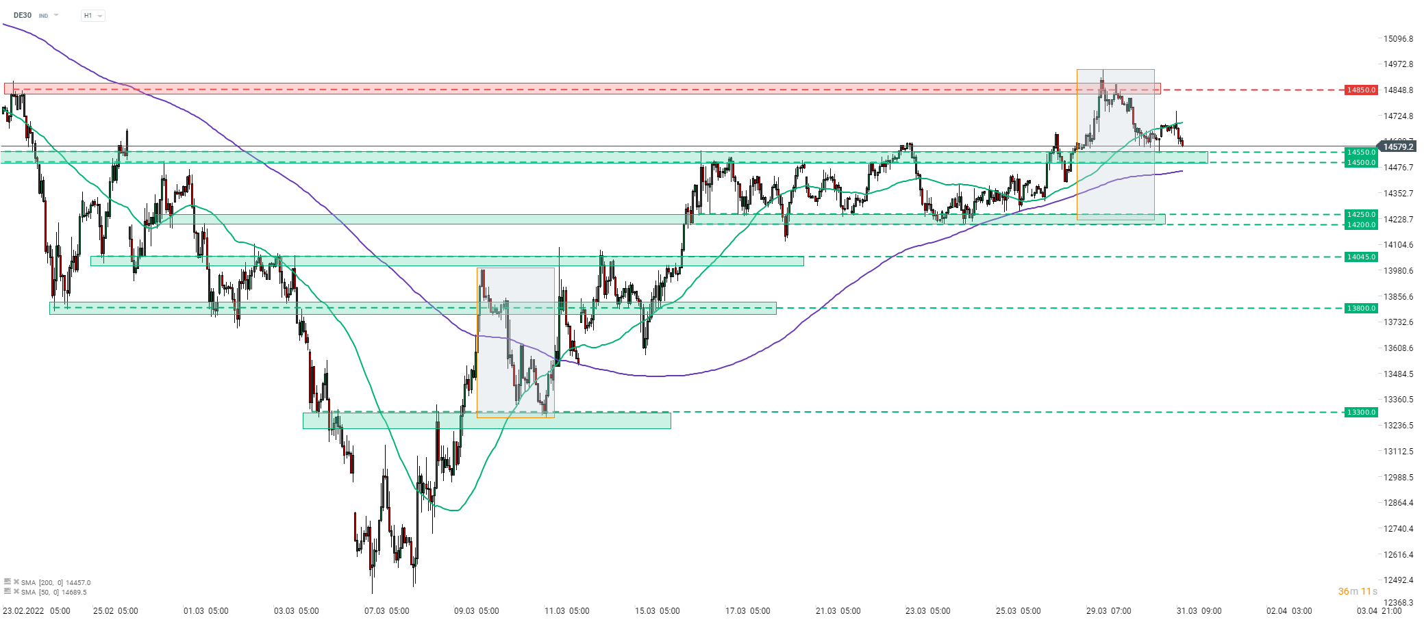 DE30 dropped yesterday but managed to defend a support zone ranging between 14,500 and 14,550 pts. While the index managed to recover slightly later on, bulls struggled to deliver a break above the 50-hour moving average (green line). It looks like the German index is eyeing another test of the 14,500-14,550 pts support zone. A period of range trading between 14,500 pts support and 14,850 pts resistance cannot be ruled. Source: xStation5