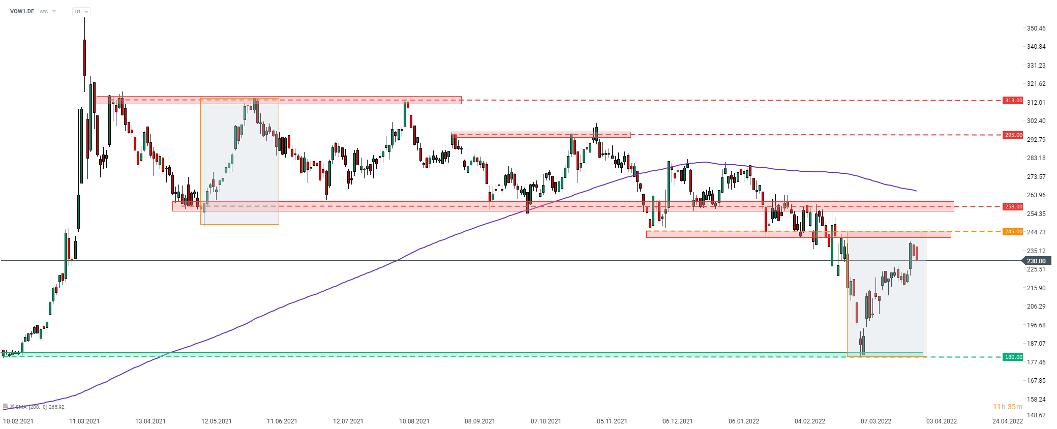 Shares of Volkswagen (VOW1.DE) trade lower today after the company warned about potential drop in production in China due to lockdowns. Stock has halted advance slightly below the resistance zone marked with previous price reactions and upper limit of market geometry earlier this week. As neither market geometry, nor previous local high was breached, downtrend structure is left intact. Source: xStation5