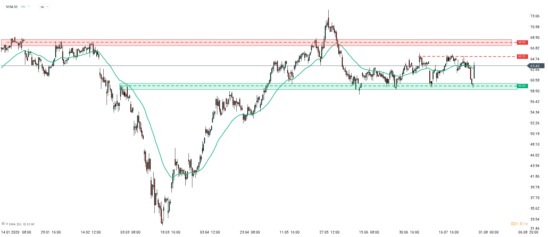 Nemetschek (NEM.DE) bounced off the support zone at €59.50 on the back of a solid Q2 earnings report. The first resistance to watch, in case of a continuation of an upward move, can be found at €65.25. This swing area limited the previous two upward moves. More important resistance can be found near pre-pandemic highs at €68. Source: xStation5