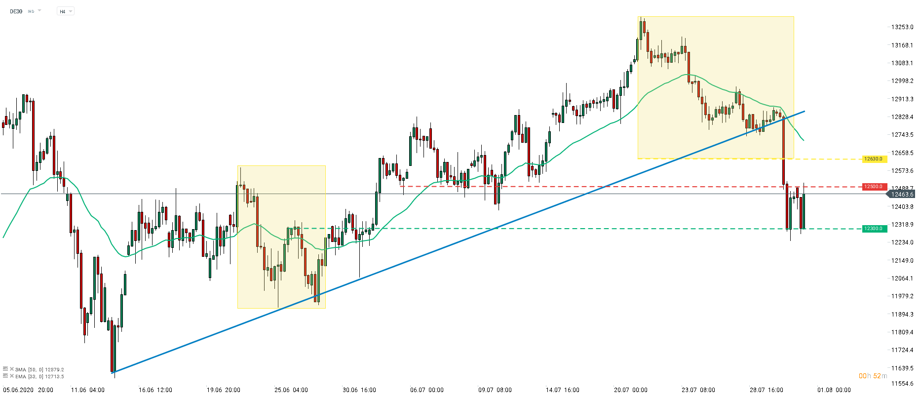 DE30 painted a double bottom near the 12,300 pts handle. Index recovered at the beginning of today's European session and tested overnight highs in the 12,500 pts area. However, DE30 failed to break above this hurdle and ongoing pullback hints that we may see a sideways move in the 12,300-12,500 pts range today. Source: xStation5