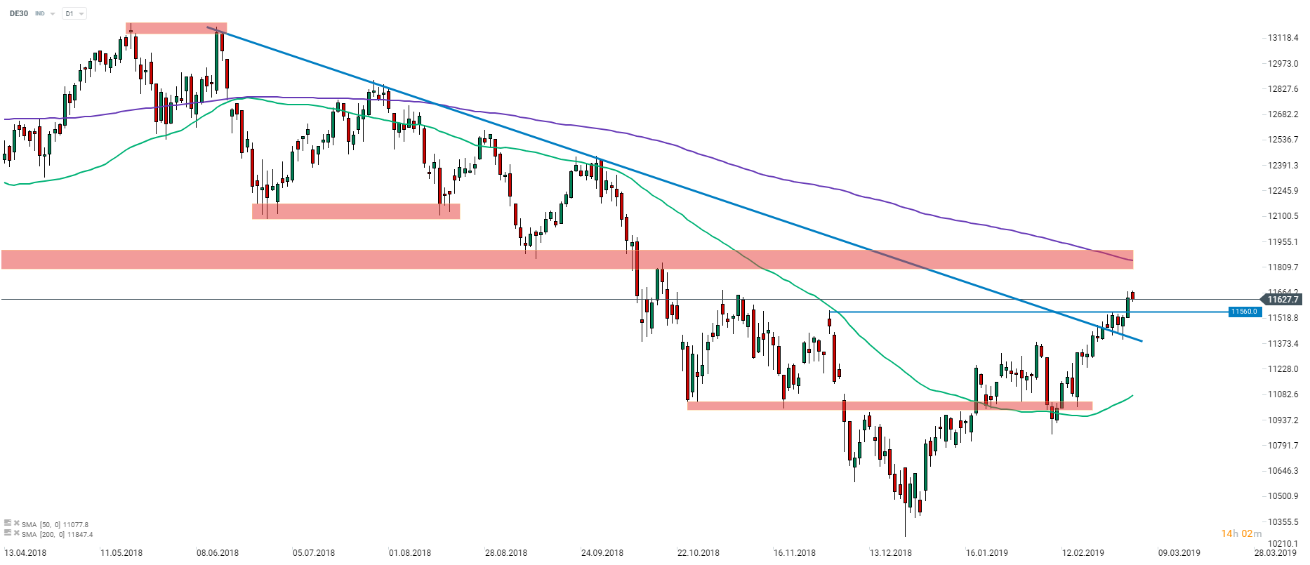 DE30 (DAX futures underlying) opened higher on Monday but it began moving lower almost immediately after session launch. Given the latest steep advance of the German benchmark, we may see a correction in the nearby future. However, in case the price breaks back below the breakout level of 11560 pts, future of the short-term uptrend may be questioned. Source: xStation5