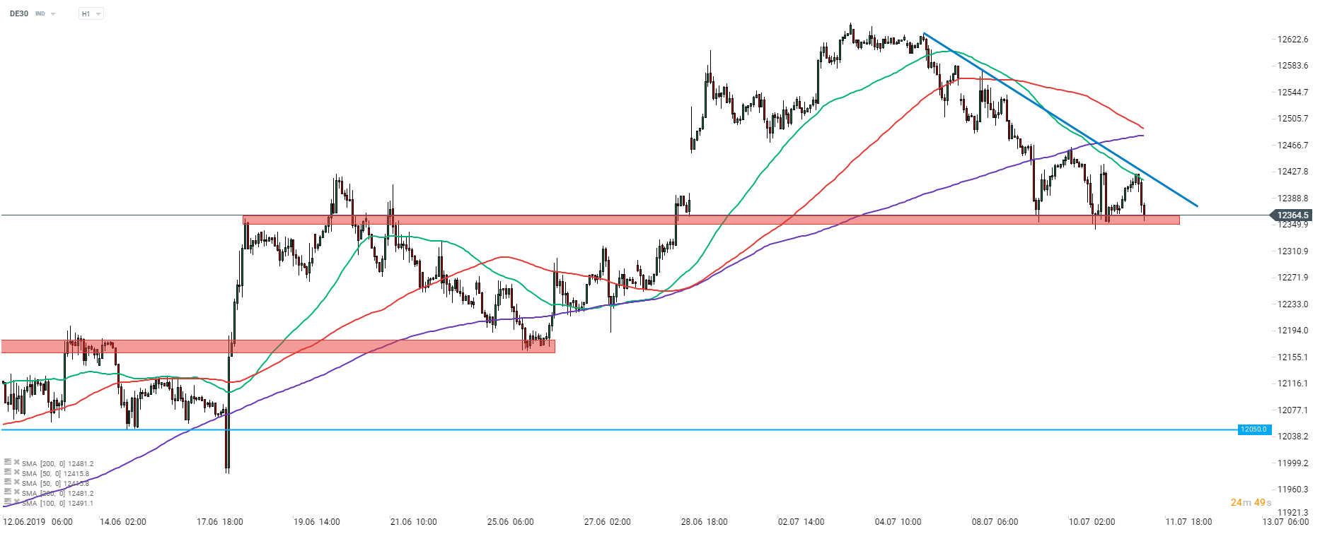 Downward momentum on the DE30 market eased as of late. The German index is trying to break below the short-term support zone around the 12350 handle for the third time this week. In case this hurdle is once again defended by bulls, it will be crucial whether the index manages to break above the downward sloping trend line. In case it is - way towards YTD highs would be left open. Source: xStation5