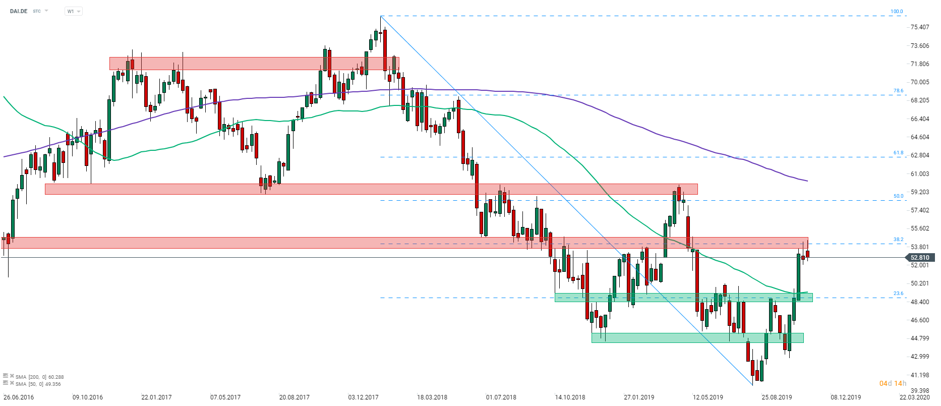 Following three weeks of a strong upward move, price action on Daimler (DAI.DE) chart eased in the previous week. Share price of the German carmaker struggles with breaking above the resistance zone ranging around the 38.2% (€54.15) Fibo level of the downward move started in late-January 2018. Should the ongoing pullback last, bears may eye a test of the support zone ranging around the 23.6% Fibo level (€48.85). Source: xStation5