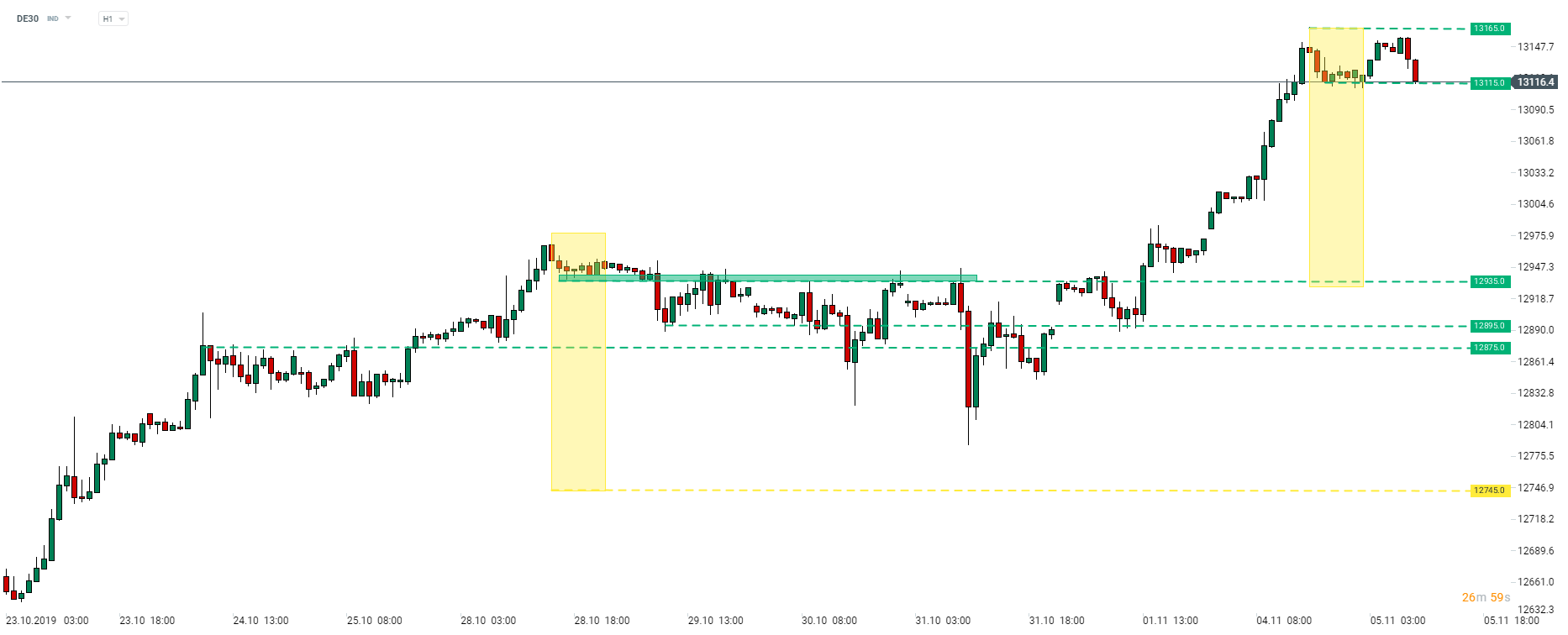 DE30 delivered another solid upward move yesterday. The German index reached the 13160 pts handle, that is marked with the double top pattern from May-June 2018. Rally was halted there and the index began to trade sideways in between 13115 and 13165 pts handle. These levels should serve as the nearest, respectively, support and resistance over the short-term. A break above the 12165 pts handle would call for resumption of an upward move and could lead the index to 13530-13580 pts area where all-time high can be found. On the other hand, a break below the 12930 pts, the lower limit of the Overbalance structure (yellow box), would signal a reversal in a short-term trend.