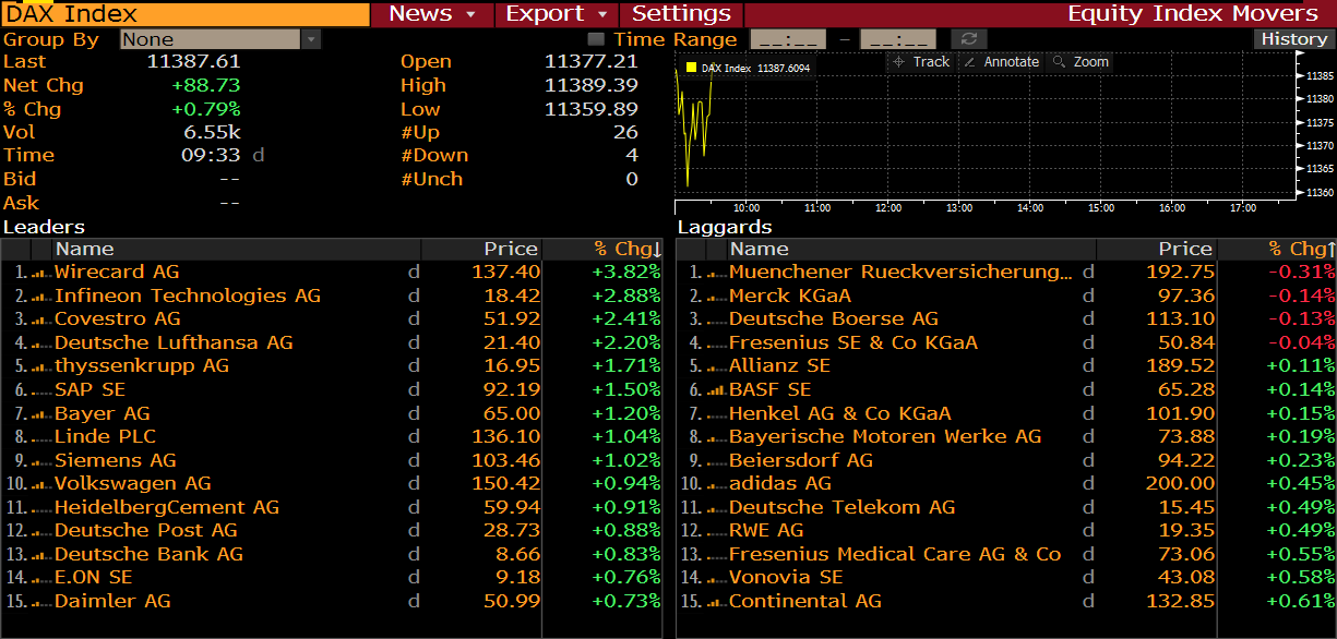 Almost all stocks listed in the German DE30 are on the rise today. Source: Bloomberg