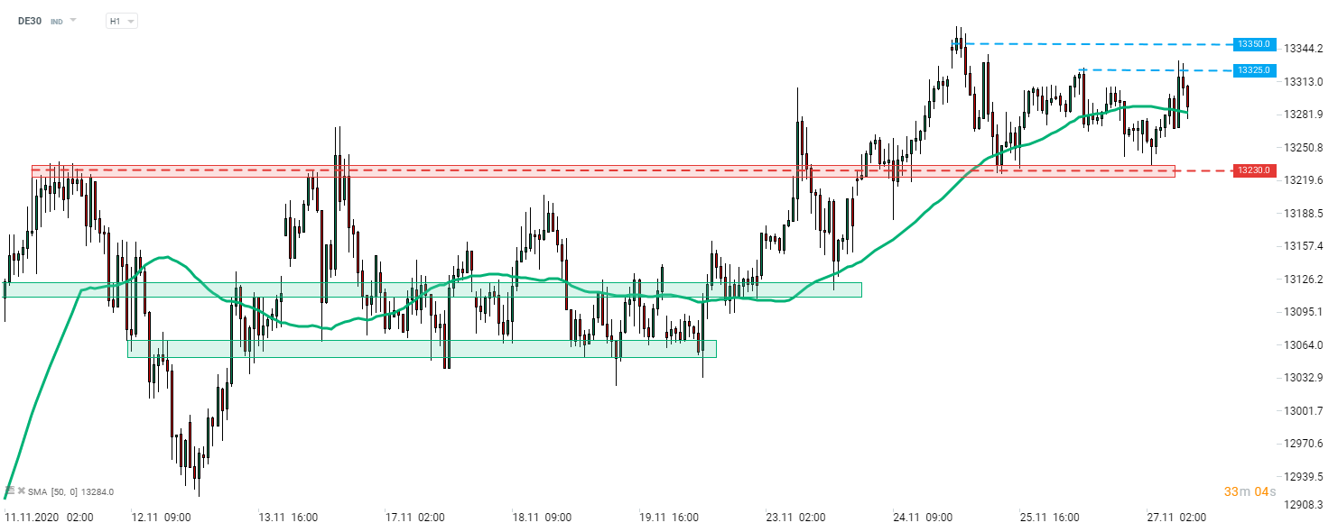 DE30 remained in a narrow 90 pts range yesterday. German index retested the support zone at 13,230 pts overnight and moved towards yesterday's high in the 13,325 pts area. Nevertheless, bulls were unable to break above this resistance and a pullback started. DE30 is trading near the 50-hour moving average at press time. As the economic calendar is empty today, the index may remain in the 13,230-13,325 pts range throughout the session. Brexit-related headlines could offer some volatility but the market has been looking past these recently. Wall Street session will be held today but it will be a shorter one (2:30-6:00 pm GMT).