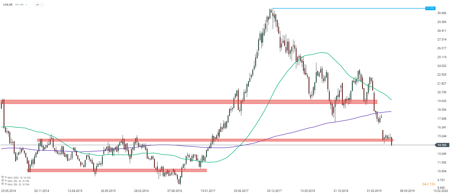 Lufthansa (LHA.DE) shares performed poorly in the second quarter of 2019 and earnings report released today showed that company’s business was struggling in that period as well. Today’s drop brought the price below the support zone ranging €14.60-14.90 and the stock is trading at the lowest level since March 2017. The next important price zone can be found at €10.80-11.20 - the lower limit of the trading range from October 2014-March 2017. Source: xStation5
