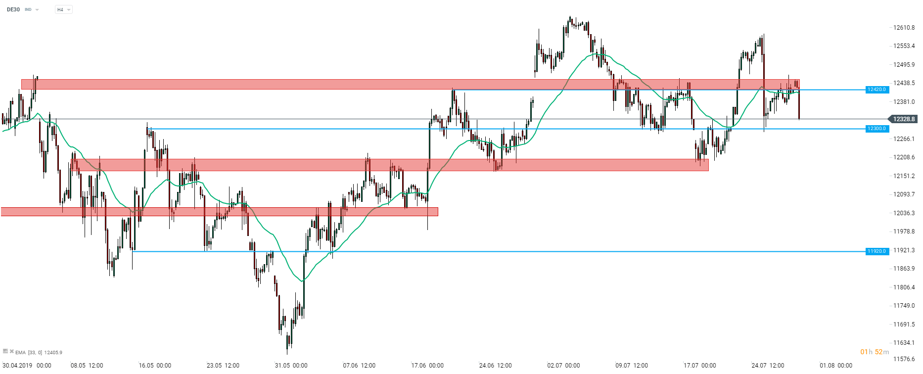 The German DE30 once again failed to break above the 12420-12450 pts area. Range of disappointing earnings reports from major German firms is sending the index significantly lower at the beginning of Tuesday’s session. The 12300 pts handle is the support level to watch in case the downward move is extended. Source: xStation5