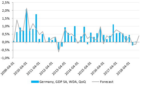 The German economy may have expanded at 0.4/0.5% QoQ during the first three months of the year. Source: Macrobond, XTB