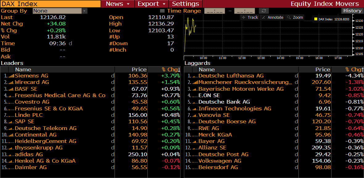 Siemens (SIE.DE) shares are leading the gains this morning following solid earnings. Source: Bloomberg