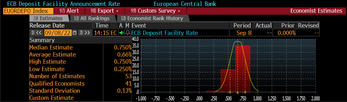 The swaps market is currently pricing a 75% chance of a 75 basis point rate hike by the ECB at its meeting next week. Source: Bloomberg