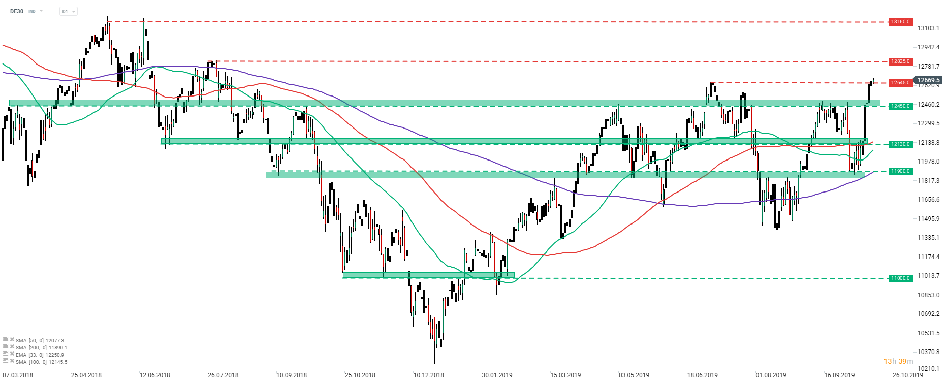 In spite of intraday struggles, DE30 managed to close higher and above early-July peak at 12645 pts yesterday. The German index is pushing higher today and the focus shifts to important resistance at 12825 pts. The 12590-12645 pts area remains to serve as a near-term support zone and should be watched closely in case on any pullback. Traders should keep in mind that risky assets, like stock market indices, are likely to be subject to increased volatility today as EU and UK officials will meet at Brexit summit while US Senate is expected to approve a bill supporting protests in Hong Kong. China strongly opposes the approval of the bill and, in case Senate goes through with its plans, Sino-US relationship may deteriorate.