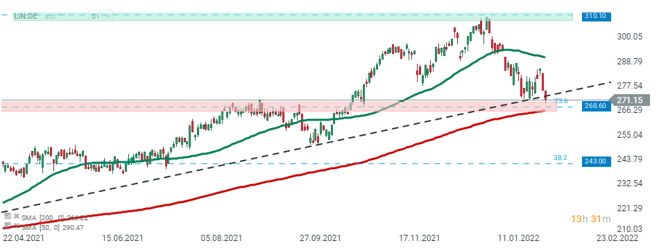 Linde (LIN.DE) stock price broke below upward trendline and is currently testing major support at €268.60 which is marked with previous price reactions, 200 SMA (red line) and 23.6% Fibonacci retracement of the upward wave launched in March 2020. Should beak lower occur, downward move may accelerate towards next support at €243.00. Source: xStation5