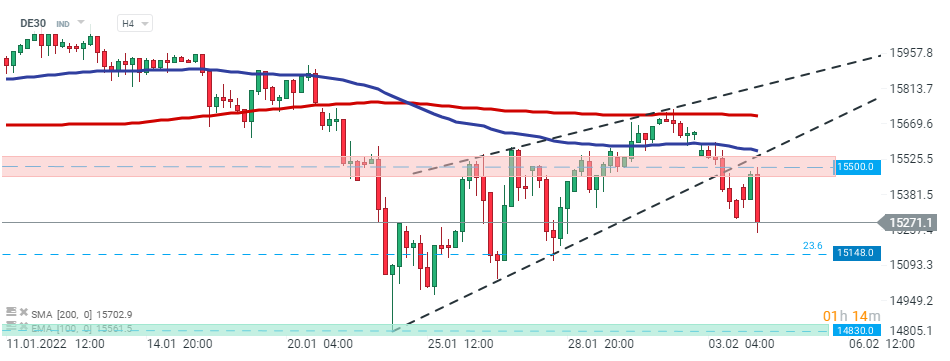 DE30 - despite upbeat start of today's session buyers failed to uphold momentum and index bounced off the resistance at 15,550 pts level, which coincides with lower limit of the triangle formation. Index is currently heading towards support at 15148 pts which is marked with 23.6% Fibonacci retracement of the upward wave launched at end of October 2020. Only a break above the aforementioned 15,550 pts resistance could see sentiment change to bullish. Source: xStation5