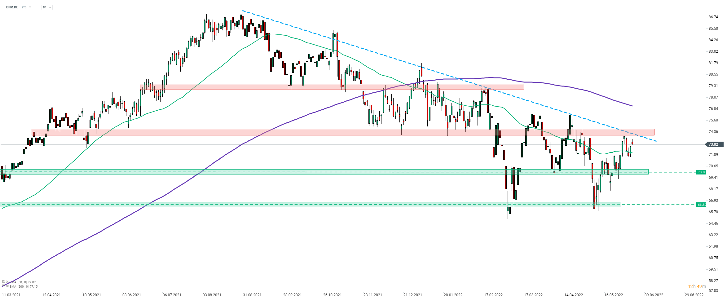 Brenntag (BNR.DE) launched today's trading higher, thanks to an upgrade at Baader Helvea. However, stock started to pull back following the session launch. The near-term levels to watch are support in the €70 area and resistance in the €74 area, marked with downward trendline. Source: xStation5