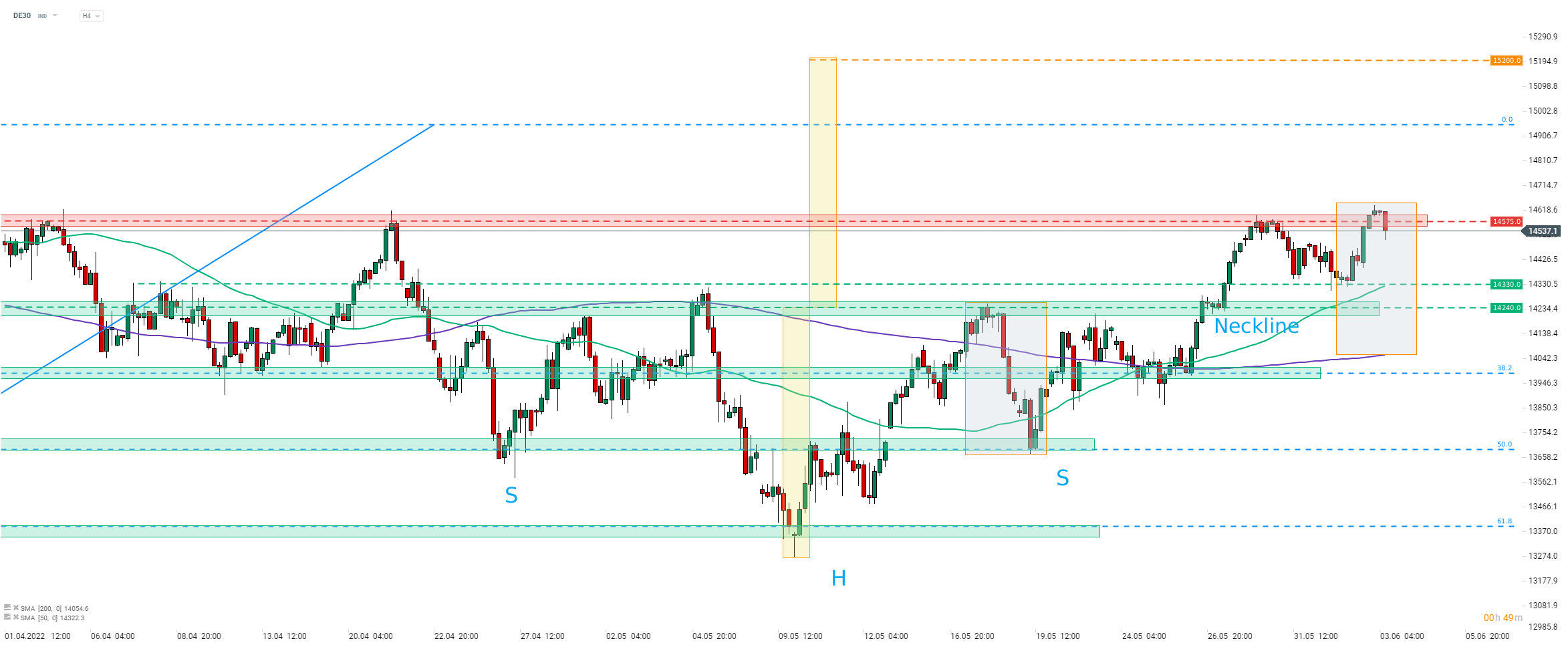 Technical situation on DE30 has changed little over the past day. The German index managed to retest the resistance zone ranging around 14,575 pts and even broke above it for a brief moment. However, bulls failed to hold onto these gains and DE30 pulled back below the aforementioned price zone today. A lot will now depend on whether it is just a brief pullback or whether the index will return below the 14,575 pts zone for longer. If the latter option is considered, a pull back towards a recent low at 14,330 pts area cannot be ruled out. 200-session moving average (purple line) and lower limit of the Overbalance structure in the 14,050 pts area mark key near-term support.