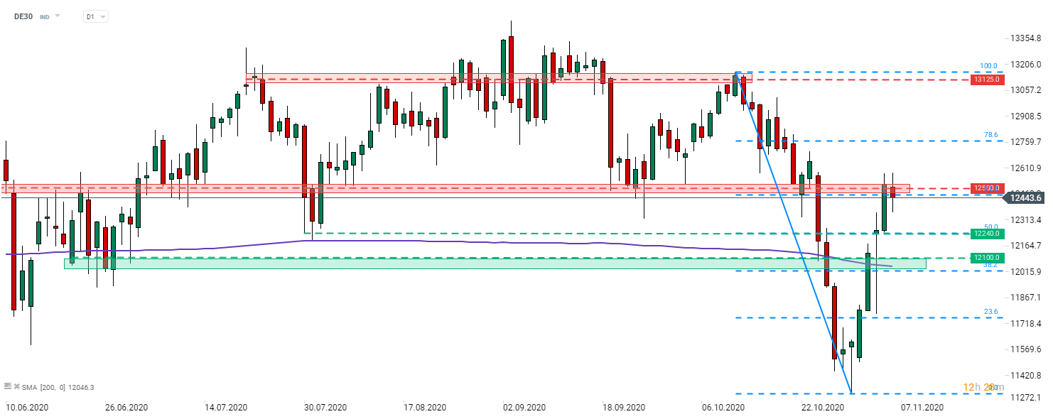 DE30 halted the rally at 12,500 pts resistance. The index is pulling back below the 61.8% retracement of recent drop as investors are getting ready for post-elections legal battles. Support marked by 50% retracement and low from the turn of July and August is the near-term level to watch (12,240 pts) while zone ranging below 12,100 pts remains the main hurdle for bulls. Elevated volatility is expected in the early afternoon when NFP report is released and more election results will be reported. Source: xStation5