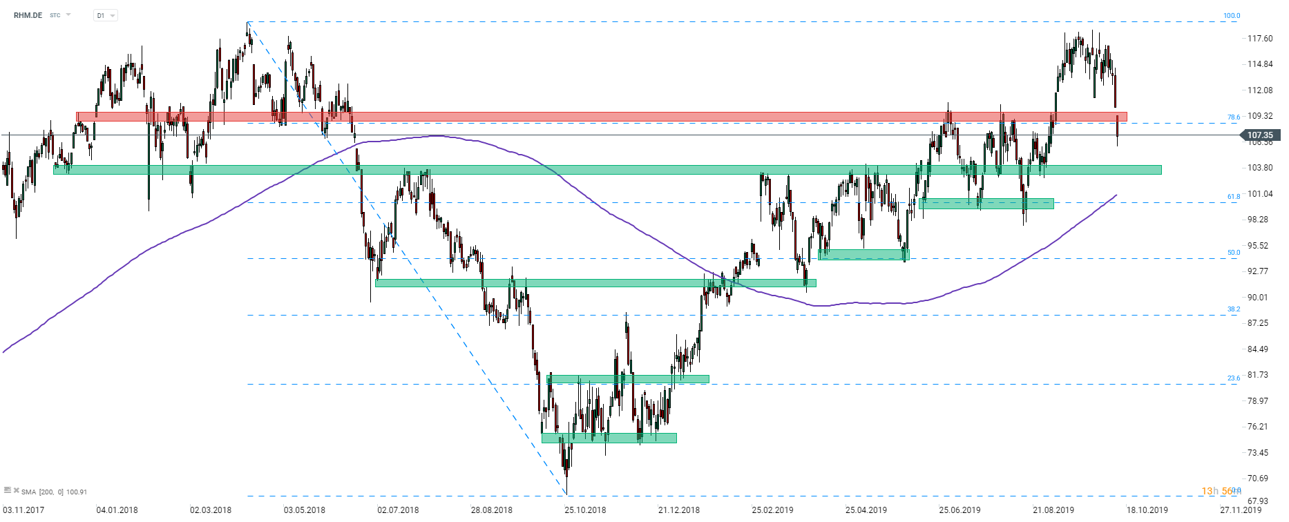 Rheinmetall (RHM.DE) extends a pullback from the YTD high to above 10%. The company may remain under pressure as lack of German arms sales to Turkey could significantly impact its business. In case the downward move continues there are two support zones to watch - the first ranges €103-104 while the second can be found near the 61.8% Fibo level of last year’s downward move (€100 area). Source: xStation5
