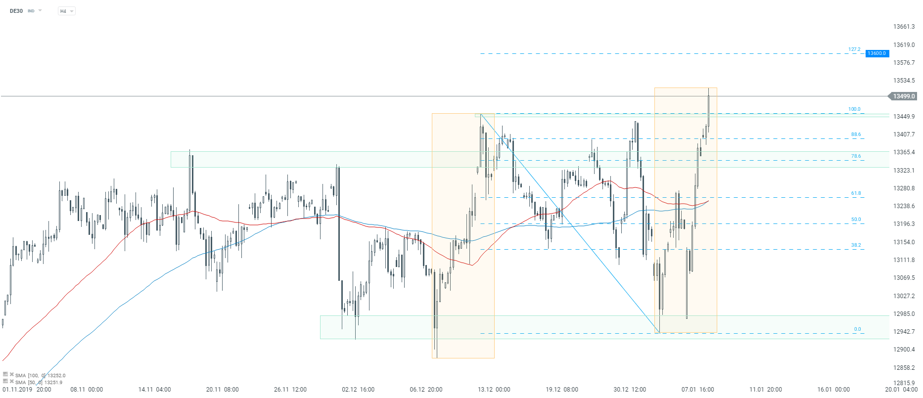 DE30 benefits from risk-on moods and surges to the highest level in 2 years. Morning surge on the German benchmark was halted by the upper limit of the market geometry that equals the range of the upward impulse from 12-13 December 2019. Having said that, the area around 13520 pts handle could serve as a near-term support to watch and a break higher would pave the way towards the 127.2% exterior retracement of downward of recent downward move (13600 pts). Note that this level coincides with an intraday ATH for DE30 therefore resistance there is likely to be stronger. Should a pullback occur, traders may look for support in the 13420-13430 pts area.