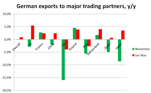 A pack of the German data was released today at 7:00 am GMT. Industrial production figures for November showed an increase of 1.1% MoM against an expected 0.8% MoM. The reading can be seen as a relief after yesterday’s factor order released turned out to be a major disappointment. Solid print was possible thanks to pharmaceutical production rebounding off the low year-ago base. Industrial production beat is to some extent overshadowed by lacklustre trade data that was released at the same time. Exports in November dropped 2.3% MoM (expected -0.9% MoM) while imports declined 0.5% MoM in spite of an expected 0.1% MoM advance. Germany experienced a drop of exports to almost every major trading partner in November with exports to the United Kingdom suffering the most.