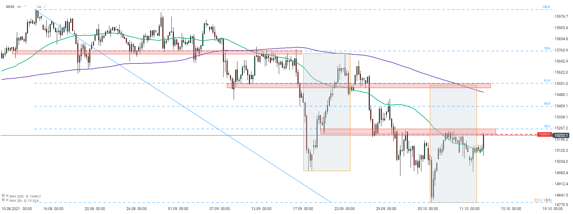 DE30 enjoys a strong upward move at the beginning of today's cash session and is approaching the area marked with last week's highs. Zone ranging betweet 15,230 pts and 38.2% retracement of a recent downward move has been tested a few times recently, both as a support and as a resistance. Breaking above this zone could trigger a stronger upward impulse. In such a scenario, the area marked with the upper limit of the Overbalance structure will become a key target for bulls. This limit can be found a touch below the 61.8% retracement (15,550 pts). US CPI release at 1:30 pm BST and FOMC minutes at 7:00 pm BST are potential movers for equity markets today.