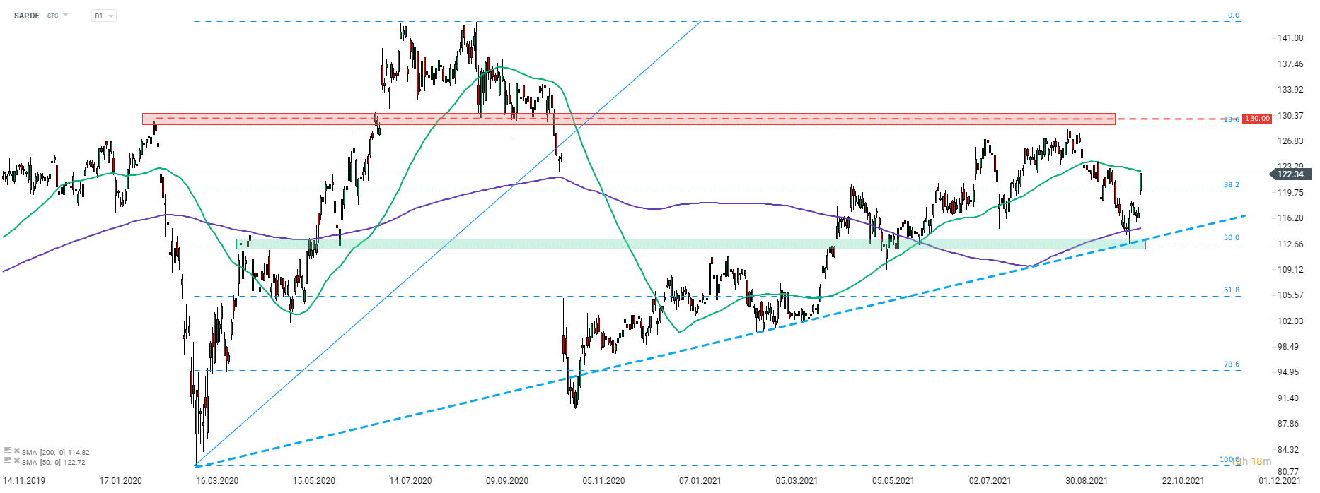 SAP (SAP.DE) launched today's trading session with a big bullish price gap. Stock benefits from cloud revenue forecast upgrade and climbs above the swing level marked with 38.2% retracement of the post-pandemic recovery move (€120 area). Key resistance zone to watch now can be found ranging above the 23.6% retracement in the €130 area. Source: xStation5