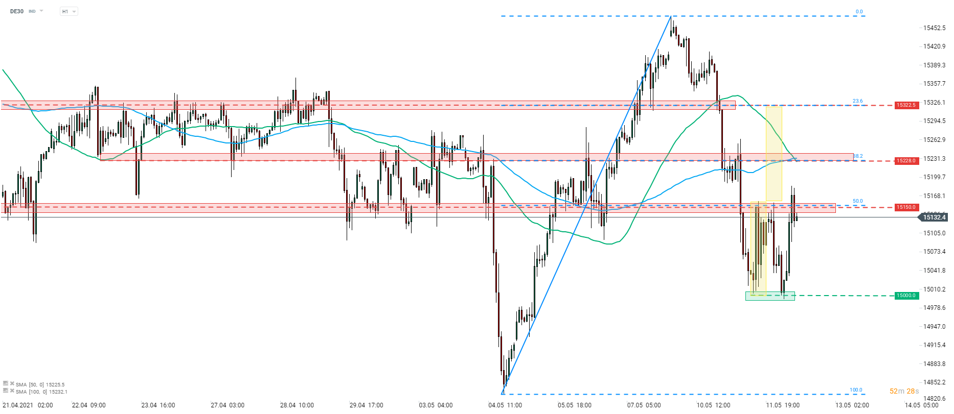 DE30 painted a double bottom at around 15,000 pts. A strong recovery move followed and the index even managed to break above the neckline of the pattern at 50% retracement of upward move launched May 4 (15,150 pts area). However, bulls failed to hold onto these gains and DE30 pulled back below. In case the index recovers and pushes back above the 15,150 pts area, continuation of the upward move may be on the cards. Target of the double bottom pattern can be found at 23.6% retracement (15,322.2 pts). However, 15,228 pts zone may act as a resistance on the way there as it is marked with 38.2% retracement, previous price reactions as well as 50- and 100-hour moving averages.