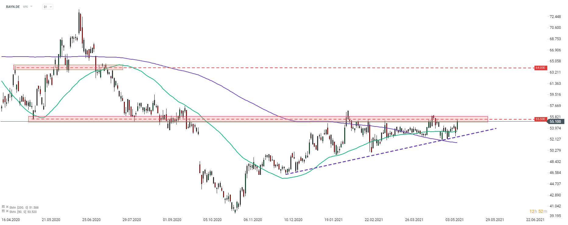 Bayer (BAYN.DE) has been trading in an ascending triangle pattern recently. Thanks to the solid Q1 earnings release, stock jumped today and is testing the upper limit of the pattern. Should we see a break above the resistance in the €55.50 area, stock may move higher towards the potential target of a breakout from the pattern in the €64.00 area. Source: xStation5