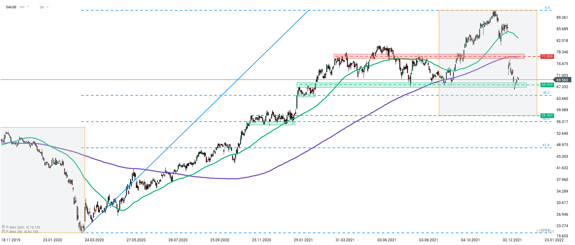 Shares of Daimler (DAI.DE) managed to snap a losing streak near the €68 support zone last week. Stock managed to recover slightly but struggled with breaking above the €70 area. Should the downward move resume and share price break below the €68 support, attention may shift to the €58.30 area, marked with the lower limit of the Overbalance structure. Source: xStation5