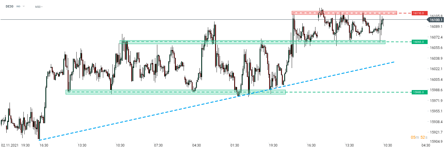 DE30 has been moving mostly sideways as of late. After a period of trading in a 15,985-16,065 pts range, the German index delivered an upside breakout. However, it was not long until DE30 started to trade in another narrow ranges - this time between 16,065 and 16,110 pts marks. Breaking through either limit of this range could, in theory, trigger an around 50 points move in a respective direction. Source: xStation5