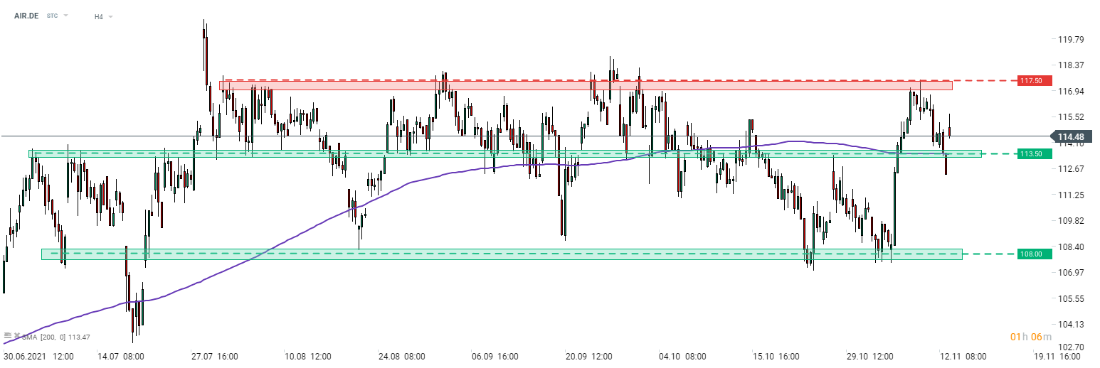 Airbus (AIR.DE) is trading higher, following news on a massive jet order from Indigo Partners. Stock launched today's trading with a bullish price gap and leaped above the 200-period moving average on the H4 interval (purple line). However, as the time passed gains started to be erased slowly and the stock trades near daily lows. Zone ranging around €113.50 mark is a key near-term support. Source: xStation5