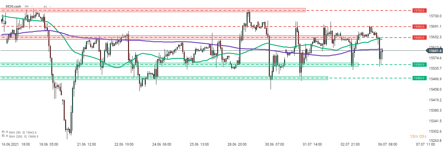 It starts to become a daily routine for DAX to experience a steep drop shortly after the launch of a cash trading session. The German index tested the upper limit of trading range at 15,690 pts during the Asian session and began to move lower later on. DE30 plunged below the 14,650 pts price zone as well as 50- and 200-hour moving averages and tested 15,550 pts support. As bulls managed to defend this area, it looks like the trading range has been upheld once again. In case DE30 manages to break back above the 200-hour moving average (purple line), an upward move towards the 15,690 pts resistance will become a base case scenario.