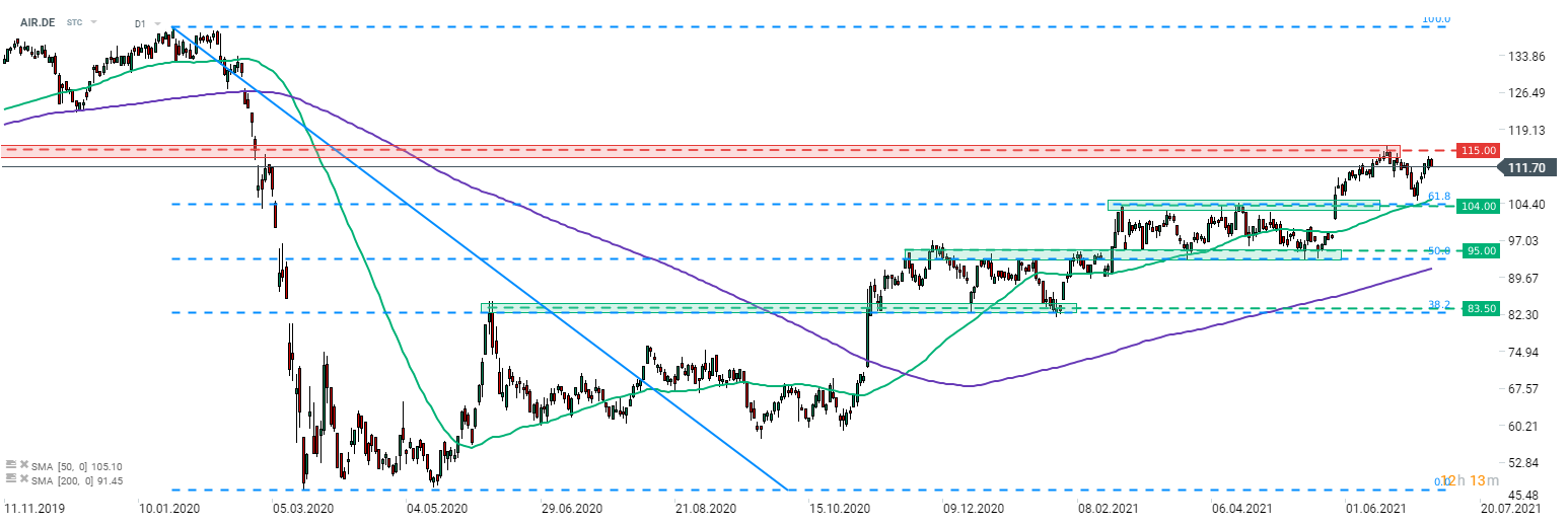 Airbus (AIR.DE) jumped yesterday when Reuters reported on delivery figures in June. However, stock failed to break above the resistance zone ranging around €115.00 mark and a pullback was launched. In case declines deepen, the near-term support to watch can be found at 61.8% retracement of the 2020 pandemic drop (€104.00 area). Source: xStation5