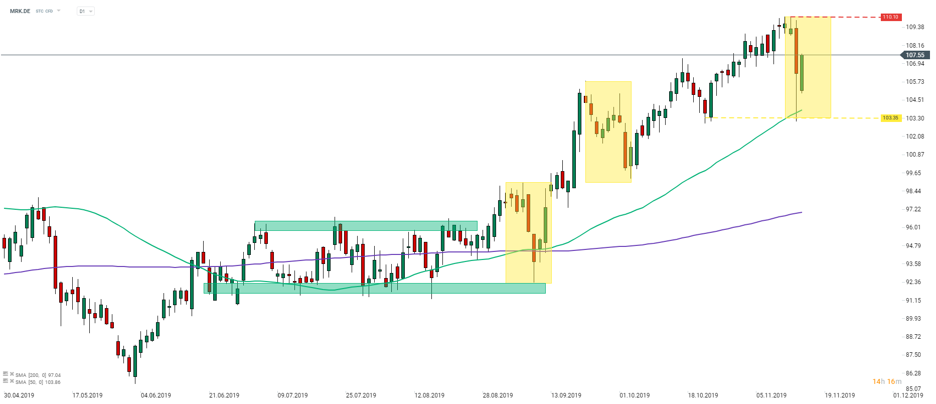 Merck (MRK.DE) plunged yesterday following the release of the Q3 earnings report. The sell-off was halted at the 50-session moving average (green line). The stock is trying to recover today producing a solid upward move. Key support to watch can be found at €103.35 - the lower limit of the Overbalance structure (yellow box) and the local low from late-October. Near-term resistance is located at the YTD high (€110.10). Source: xStation5