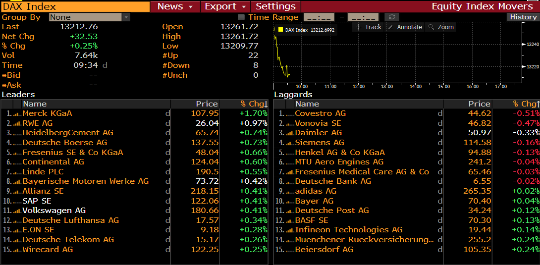 Almost every DAX member is trading higher at the beginning of Friday’s session. Risk-on moods boost valuations of trade-sensitive stocks like carmakers or Infineon Technologies. Source: Bloomberg