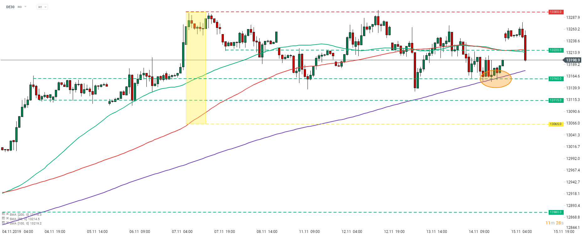 Situation on the DE30 chart remains unchanged. The index continues to trade in the 13160-13300 pts range. The lower limit was being tested yesterday but bears failed to deliver a break lower. Following today’s higher opening the index return to the upper part of the range. However, the index took quite a significant dive following the opening of today’s cash session. DE30 attempts to break below the key support zone - combination of 50-, 100-hour moving averages and the 13220 pts swing level. Should it succeed, the 200-hour moving average (purple line, 13175 pts area) could be at risk. Note that this moving average strengthened the lower limit of the trading range recently and helped the index bounce higher (orange circle). The key support remains unchanged at the lower limit of the Overbalance structure (yellow box, 13065 pts).