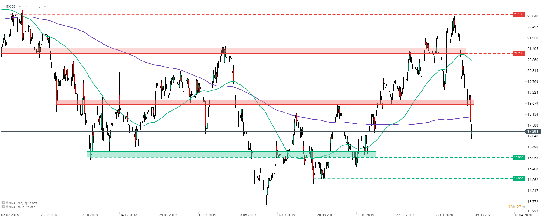 Infineon (IFX.DE) pulls back today on reports that merger with Cypress (CY.US) may be blocked. The stock dropped below 200-session moving average for the first time since November 2019 and may be set to test support at €16 unless moods improve. Source: xStation5