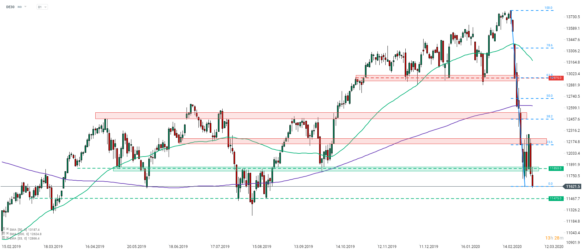 DE30 failed to make a meaningful break above the resistance zone at 12200 pts (23.6% Fibo level). The index is pulling back today and testing a low from the beginning of the week (11600 pts). Note that in case bulls fail to halt declines there, the index may move to as low as 11475 pts. Source: xStation5