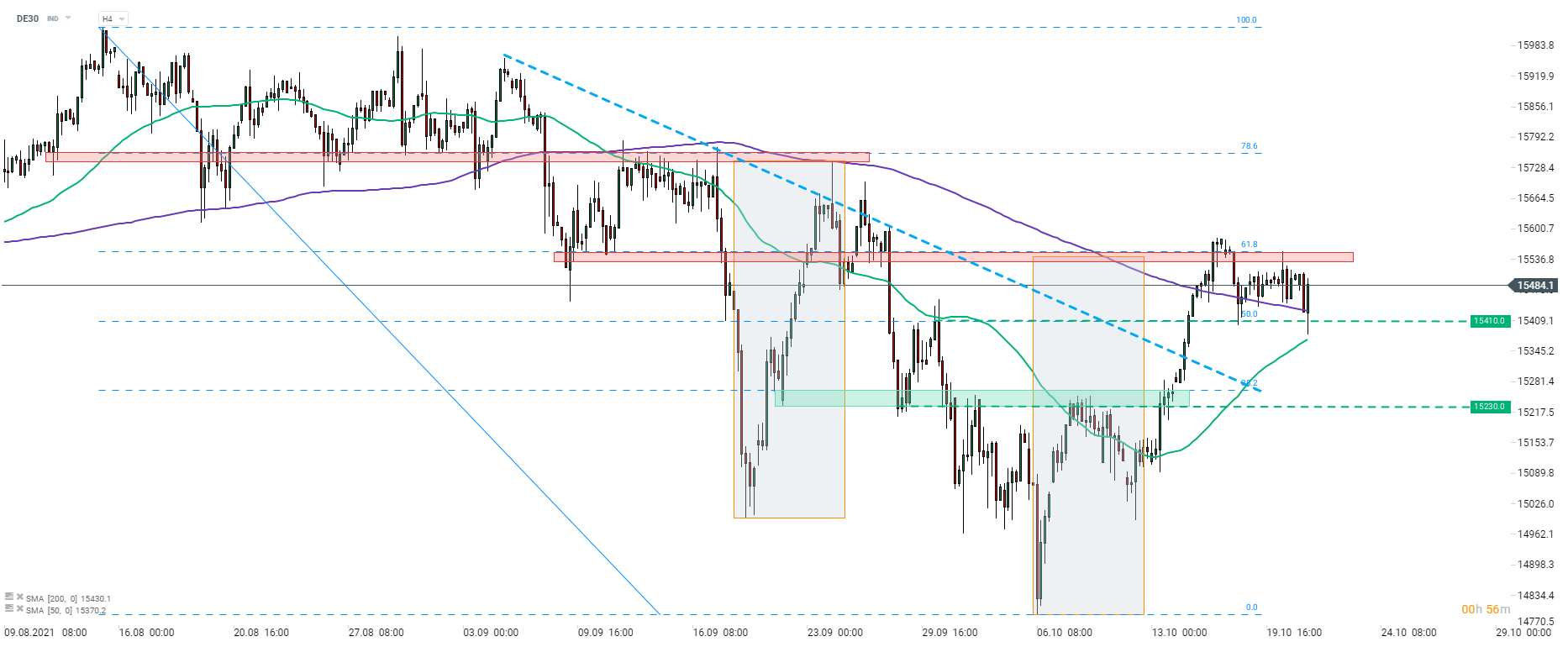 Investors can get a sense of deja vu when looking at DE30 in the morning. Price action patterns on European mornings have been very repeatable this week with the German index pulling back ahead of the session launch and testing 200-period moving average on H4 interval. Market reversed and moved towards the 15,500 pts area after each test of the aforementioned moving average . Breaks above this zone were limited by the resistance zone marked with 61.8% retracement of the downward move started in August (15,550 pts area). However, it should be noted that the index has been painting lower lows below the 200-period moving average and the average itself is downward sloping. As a result trading range gets wider but topside resistance remains unchanged. This suggests that bulls may be running out of steam and traders should be aware of a potential downside reversal.