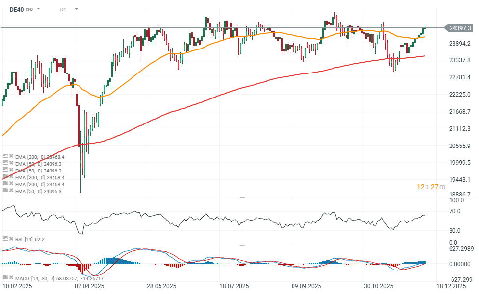 DAX futures are maintaining upward momentum on the last trading session of the week. The main challenge for the bulls today is to push above 24,500 points, which could potentially open the path to new record highs.