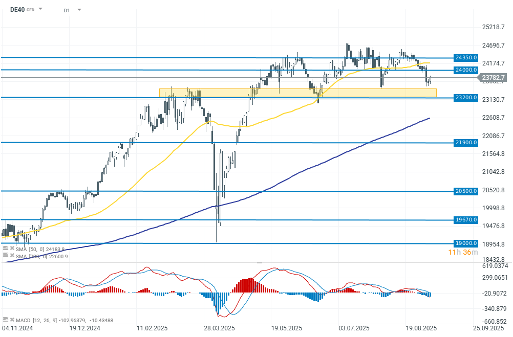 The German index is gaining 0.60% today to 23,770 points. The rebound is important from a technical analysis perspective, as the support zone above 23,200 points (yellow zone on the chart) has been defended.