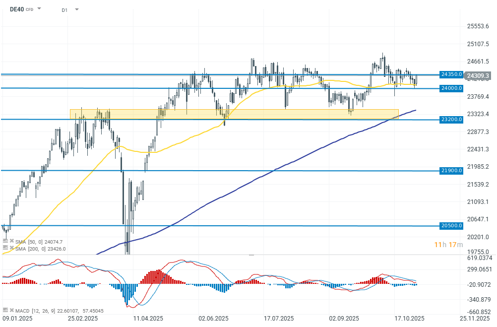 The German DAX is up 1.10% to 24,300 points, remaining in a narrow consolidation range above the 24,000-point level.