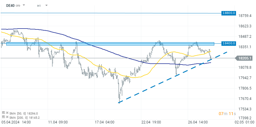 After the publication of GDP data for the Eurozone, indices attempt to rebound. The report was better than expected, suggesting a slightly better state of the European economy. Along with the indices, the Euro gains even more, becoming the strongest G10 currency. Besides the GDP report, we also saw April inflation data. Core inflation met expectations at 2.4%. However, core data were also higher than expected, confirming the concerns of European Central Bank Vice President Luis de Guindos about the risk of another rebound. De Guindos emphasized yesterday that the geopolitical situation, particularly in the Middle East, poses a particular risk to inflation.