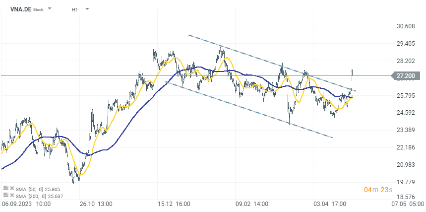 Vonovia (VNA.DE) gains almost 4.00% after the company reported its quarterly earning report. Vonovia returned to profit in the first quarter, despite the sector facing its worst crisis in decades. The company announced it expects property values to bottom out this year. Vonovia reported a profit of 335.5 million euros ($359 million), bouncing back from a loss of 2.088 billion euros a year earlier. The company sees a return to growth in sight and aims to focus on increasing earnings from 2025 onwards.