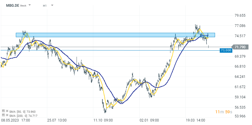 Mercedes-Benz (MBG.DE) dips 3.80% following the Q1 earning report. Mercedes had a weaker than expected start to the year due to supply chain issues and model changes. In the first quarter, turnover fell by 4.4% to €35.9 billion ($37.4 billion), and earnings before interest and taxes dropped nearly 30% to €3.86 billion. The company's passenger car division saw its adjusted operating profit margin slip by 5.8 percentage points to 9.0%, with declines in sales and model changes in the top segment negatively impacting results. Mercedes-Benz reported a consolidated profit of €3.03 billion, down by about a quarter from the previous year, but confirmed its annual forecasts.