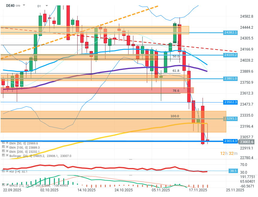 - The retreat from risk and shaken faith in the AI boom is putting pressure on the valuations of European tech companies. Infineon (IFX.DE) is losing 4%, ASML (ASML.NL) is down over 7%, Siemens (SIE.DE) is depreciating by 8%.